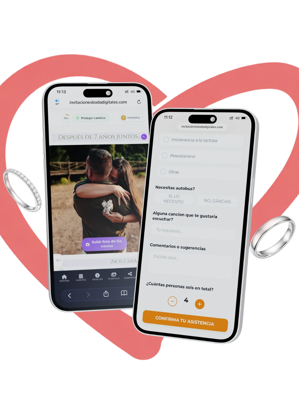Diseñad vuestra invitación perfecta con el editor en vivo. Música, mapa, confirmación de asistencia y cuenta atrás, todo listo en minutos y sin necesidad de registro.